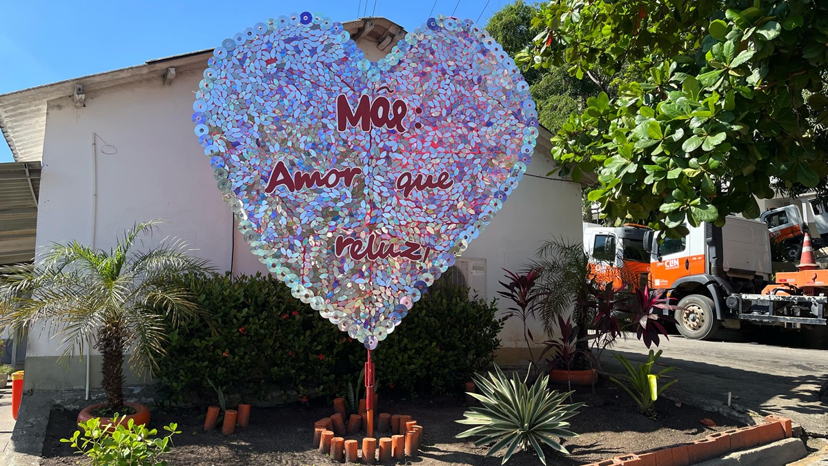 Com a mensagem “Mãe, amor que reluz”, escrita em letras emborrachadas, o coração ganhou vida sobre uma estrutura de ferro. Para ornamentar a peça, foram utilizados três metros de tecido TNT e centenas de CDs reaproveitados, formando um mosaico que encanta à primeira vista.