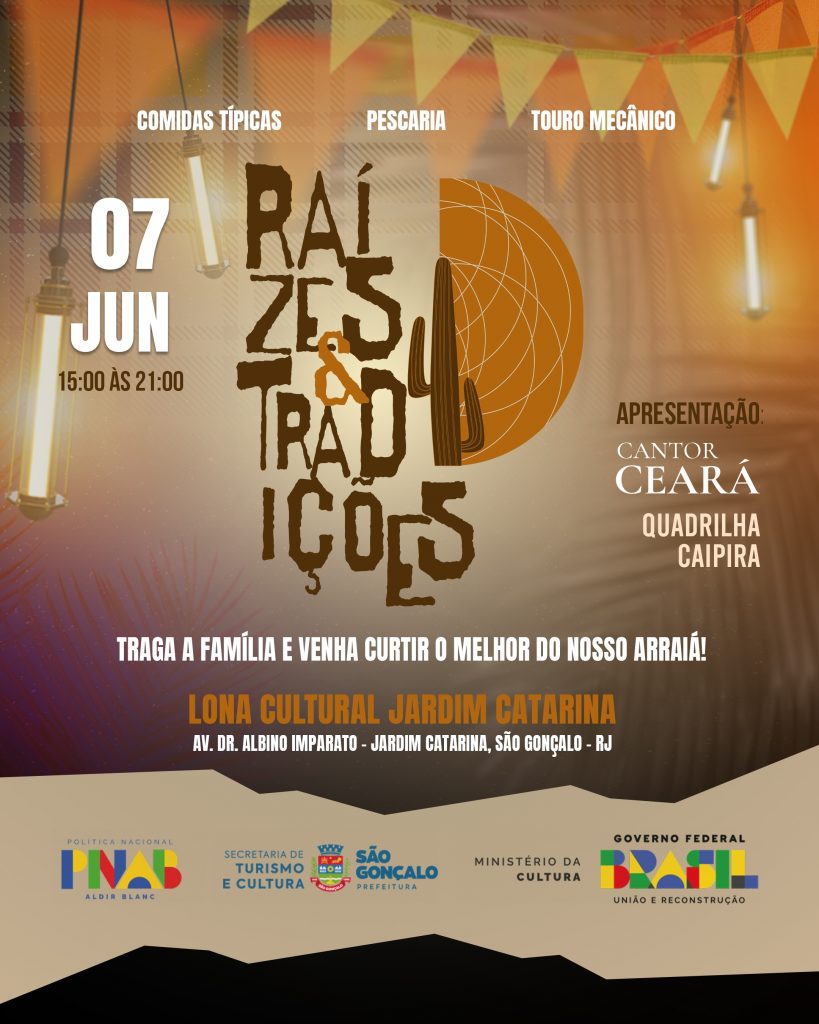 No sábado (7), a Lona Cultural do Jardim Catarina recebe o projeto Raízes e Tradições, a partir das 15h. O público poderá curtir apresentações culturais, comidas típicas, brincadeiras tradicionais, o show do grupo Canto Ceará e uma quadrilha junina animada. O evento, que tem entrada gratuita, tem a proposta de valorizar a cultura nordestina e faz parte dos projetos selecionados no Edital Multilinguagens, da Política Nacional Aldir Blanc em São Gonçalo.
